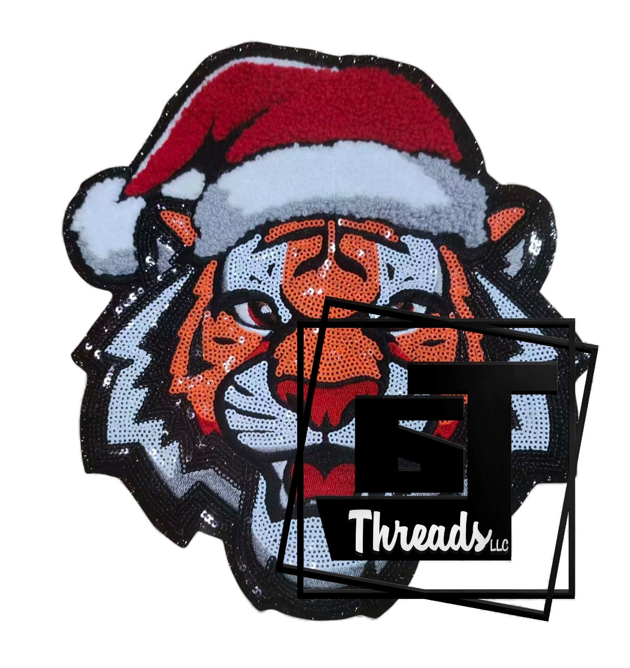 This exclusive sequin tiger patch with a Santa hat is available exclusively to 6J Threads LLC. Featuring shimmering sequin details and festive holiday charm, this unique patch brings character and sparkle to any project. A special offering reserved for our valued wholesale partners.